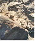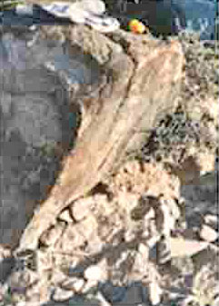 sticking out of the ground next to the large angular boulder in