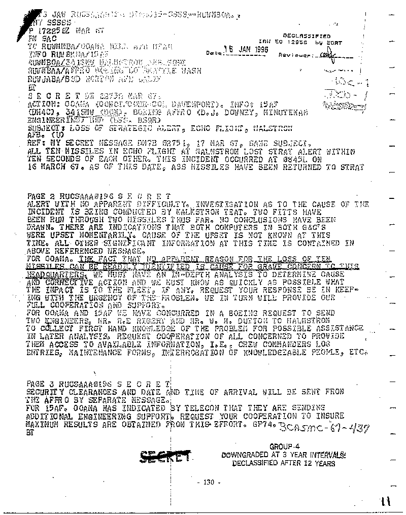I’ve got a copy of a telex which we received under FOIA coming from SAC headquarters and coming to Malstrom and other bases right after the morning that happened saying that this incident was of extreme concern to SAC headquarters because they couldn’t explain it. Nobody could explain what happened. And yet we never got de-briefed. And we were cleared for very high classification because these are nuclear weapons we’re dealing with.