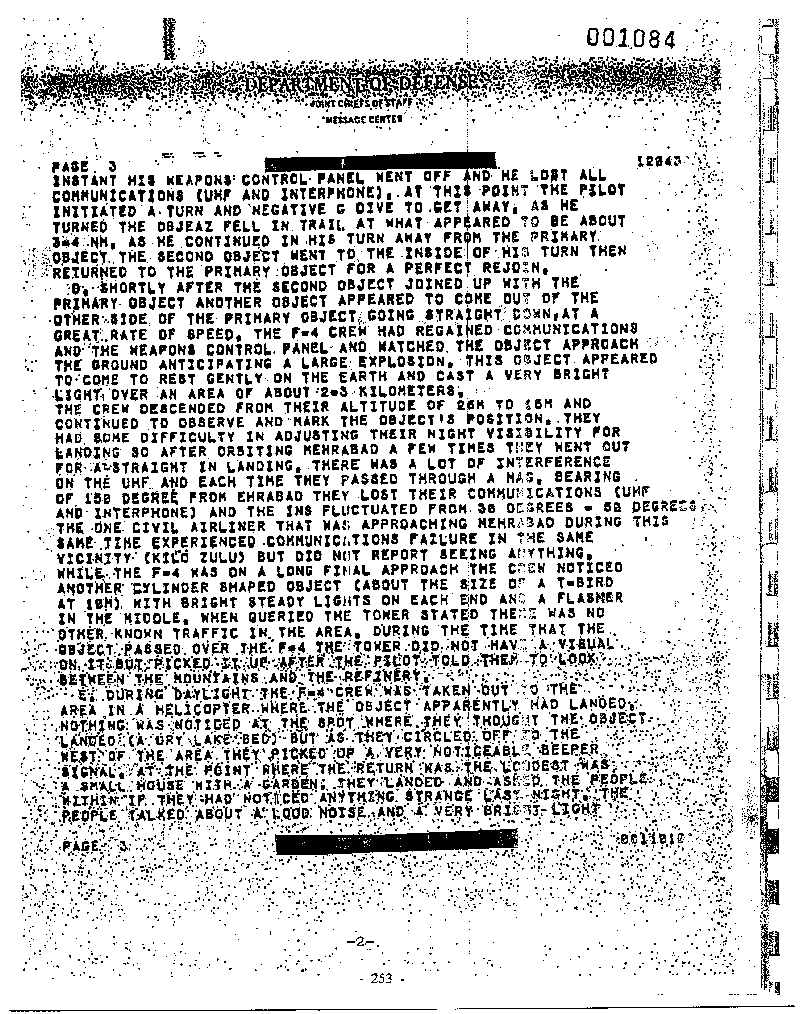 Another case we were involved with was the Iranian incident of September 19th, 1976. Both fighters were taken apart to try to find out if there was any way we could explain what really happened to those fighters which were having malfunctions at the same time. There was a situation where we had some anomalies picked up out where the sighting was- where one of the Air Force pilots saw the UFO go down to the ground. We recorded those anomalies with audio devices. We took film footage of the area and there were some strange things that showed up on that film footage. Everything that took place there at the landing area, I am not privy to. I don’t have all the information. It wasn’t something I had to be involved in. But I can tell you this much, whatever took place there had people out there for two to three weeks.