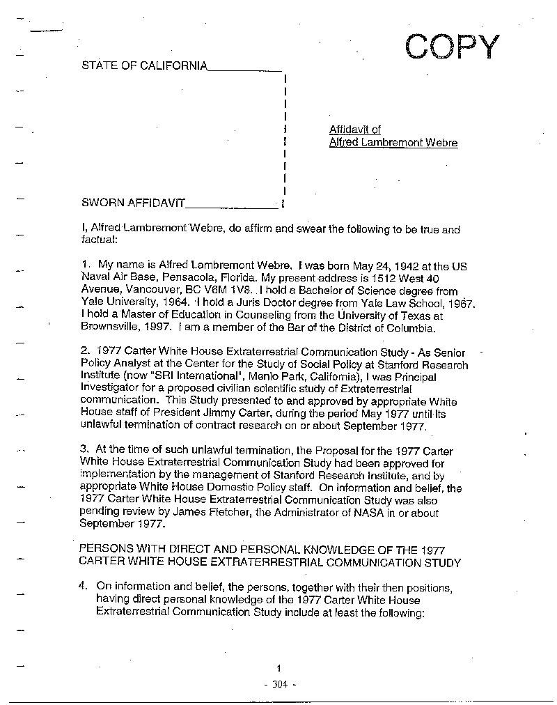 Dr. Alfred Webre holds BS and law degrees from Yale and a Masters of Education in Counseling from the University of Texas. He was a Senior Policy Analyst at the Center for the Study of Social Policy at Stanford Research Institute. In 1977 he worked on the Carter White House Extraterrestrial Communication Project through SRI. Its purpose was to gain knowledge on the subject then make policy recommendations. NASA director James Fletcher and the National Science Foundation were involved. The project was prematurely and illegally terminated by the Pentagon soon after it began even though it had already been approved within the Domestic Policy Staff of the White House.