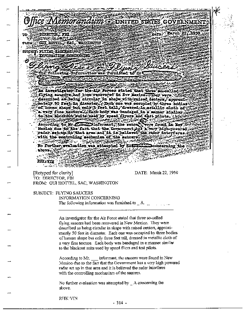 It was a pattern. The evaluation was that it might be coming from outer space beings and I got that report at the White House because I had the NSA clearances and all. Then I came back and General Trudeau pulled me in. He had organized a Research & Development project from a secondary … At first, when I reported in I was a special assistant. Then he created the Foreign Technology Division about a week later and put me in charge of it. There I started getting the autopsy reports of ET’s, and I started getting other crash reports and the artifacts from the crashes. And I visited the site here [near Roswell New Mexico] a couple of times.