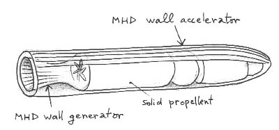 The corresponding US torpedo, named "Supercav", is able to reach 300 knots. Similar performance for the equivalent torpedo built at the same epoch by Russian, called "Sdqwal". But a MHD torpedo can go much faster. The electric power is produced by a wall generator, coupled to the nozzle of a solid propellant rocket.