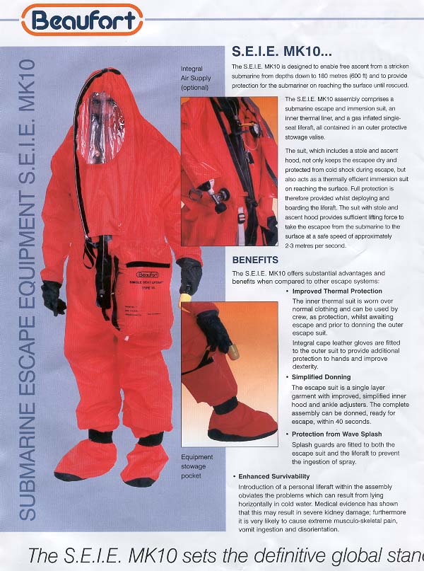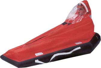 locked in. This equipment is very complete. A rubber boat is located in a bag fixed on the left leg of the man. After inflation the man can take place in and easily stand cold.