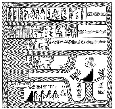 HAVING briefly referred to the origin and development of the magical, religious, and purely funeral texts which, sometimes with and sometimes without illustrations, formed the "Guides" to the Ancient Egyptian Underworld, the form of the conceptions concerning the place of departed spirits as it appears in the Recensions of the XVIIIth and XIXth Dynasties must now be considered. To reconstruct the form which they took in the Predynastic Period is impossible, for no materials exist, and the documents of the Early Empire are concerned chiefly with providing the deceased with an abundance of meat, drink, and other material comforts, and numbers of wives and concubines, and a place in Sekhet-Aaru, a division of Sekhet-hetepet, to which the name "Elysian Fields" has not inaptly been given. In later times Sekhet-Aaru, or Sekhet-Aanru, comprised all Sekhet-hetepet. Of Sekhet-hetepet as a whole the earliest known pictures are those which are painted on the coffins of