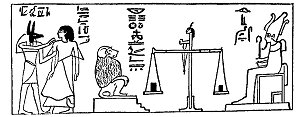 out, special and very unusual values, and the title "enigmatic writing" given to them by Goodwin is appropriate. In the ordinary Judgment Scenes we find that the heart of the deceased is weighed in the balance against the feather symbolic of Maat or righteousness, that the operation of weighing is carried out by Thoth and Anubis in the presence of the great gods, the owner of the heart himself sometimes looking on, that the gods accept and ratify the verdict of Thoth, and that the deceased is then led into the presence of Osiris by Horus. Sometimes the heart of the deceased is weighed against his whole body, as in the Papyrus of Nebseni, and at other times the pans of the scales only contain weights. In the scene before us the arrangement is quite different. Osiris is seated on a chair of state, and wears the crowns of the South and North united; in Nebseni being weighed against his heart.