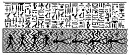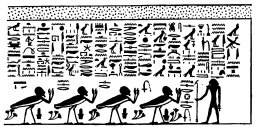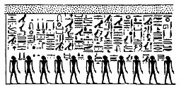 (Far left) Horus the Aged. (Right) The Burnt Enemies of Osiris.and belches fire into the face of their leader; the name of this serpent is KHETI, In each undulation stands a bearded god in mummied form, and the hieroglyphics written above describe them as "the gods who are above KHETI,"