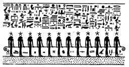 "Those who are in this picture make a rising up for Ra, and they take their paddles in this Circle of UNTI. They come into being of their own accord at the seasons when Ra is born in Nut; they come into being for the births of Ra, and they make their appearance in Nu along with him. It is they who transport this great god after he hath taken his place in the horizon of the East of heaven. Ra saith unto them:--'Take ye your paddles and unite ye yourselves to your stars. Your coming into being taketh place when [I] come into being, and your births take place when my births take place. O ye beings who transport me, ye shall not suffer diminution, O ye gods AKHEMU SEKU.'"