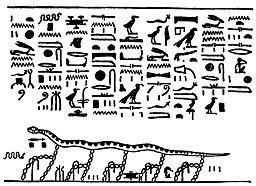 "The Children of Horus grasp firmly this serpent which is in this picture, and in this picture they rest in Nut (i.e., the sky). They heap their fetters upon him, and whilst his folds (?) are in the sky his poison drops down from him into Amentet."