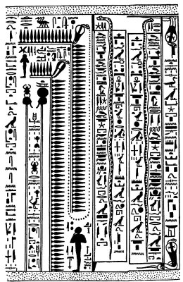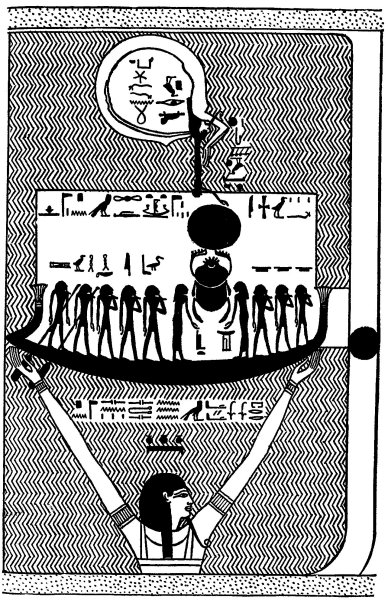 (Left) The Gate Tesert-Baiu. (Right) The doors of Sebi and Reri. The Sun-god under the form of Khepera with his Disk, in his Boat, supported by Nu and received by Nut.[paragraph continues] "They stand up on their heads, and they come into being on their staves by the gate; the heads stand up by the gate."