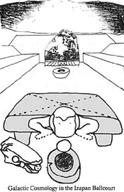Here, the head is the sun, and the splayed legs frame the birth canal that is the dark-rift in the Milky Way. Below this head is a ball and ring, which refers to the symbolism of the ballgame. [Long argument on the cosmic symbolism of the Maya ballgame omitted, which shows how the gameball is the December solstice sun and the goalring is the dark-rift in the Milky Way.]