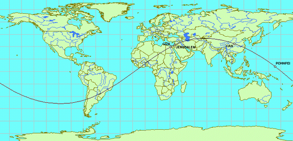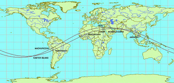 As the line of ancient sites goes around the Earth, the azimuth, or