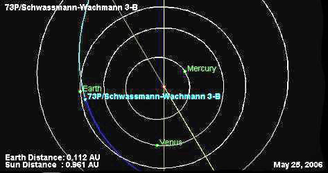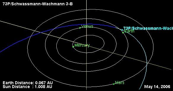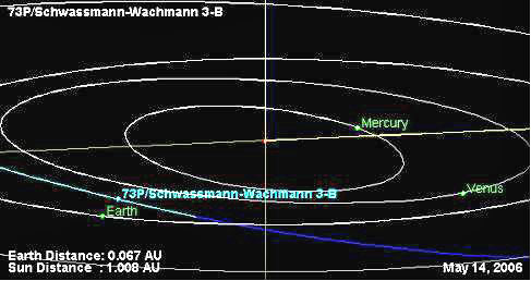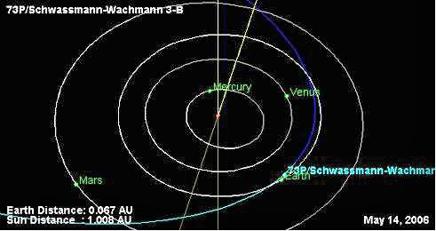 Moving now to the date of the planetary simulation for May 14, 2006; for centuries the comet Schwassmann-Wachmann has made hundreds of revolutions around the sun while remaining whole. Since the beginning of its fragmentation in 1995, it has made two elliptic revolutions around the sun.