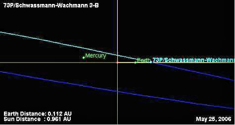 In the same way, eleven days after the closest approach on May 14, 2006, the comet, or rather fragment B, will cross the ecliptic plane exactly on MAY 25, 2006! But the comet travels faster than the Earth, and because it follows a parallel trajectory, any danger will seem isolated. It should be up to seventeen million kilometers in front of the Earth when it crosses the ecliptic path of our planet around the sun.