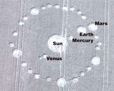Above is the 1995 crop circle called “Missing Earth”. It shows the solar system out to the asteroid belt. The Earth is missing in its orbit which, as is illustrated here, is suggesting the extinction of human civilization.