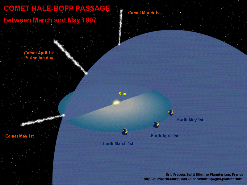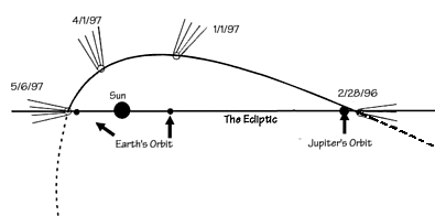 Most comets have expected orbits, or that is predictable paths from where ever they come from to their journey around the sun. Many have expected arrivals and departures, documented well ahead of their returns. Some, however are not so easy to predict. As pointed out in other sections of this page, Hale Bopp has many peculiar aspects.