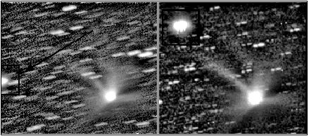Notice that the "objects" move with the comet. The distance between comet and object is comparable to the distance displayed in the other pictures on this page. This distance appears greater than the previous distance due to the fact that the comet is approximately 4 AU's closer.