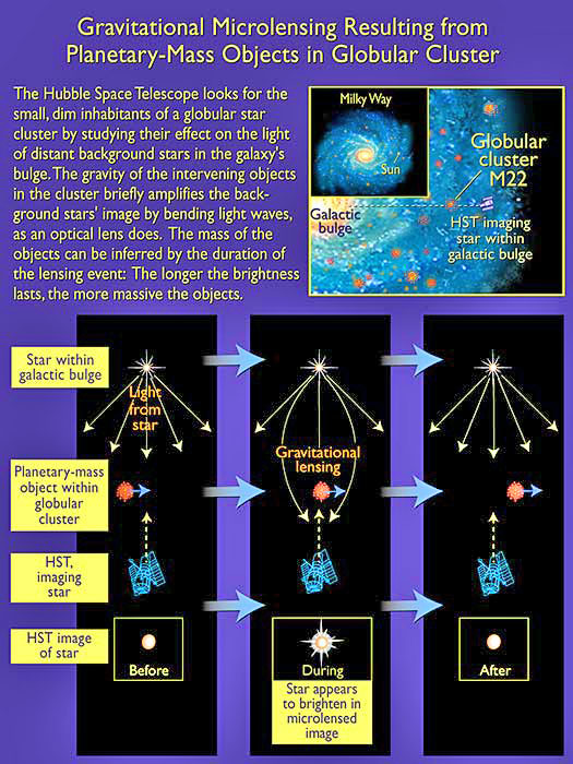 Right: A schematic diagram of microlensing. Click to enlarge. Credit: Ann Field (STScI) These microlensing events were unusually brief, indicating that the mass of the intervening object could be as little as 80 times that of Earth. Objects this small have never before been detected by microlensing observations. If these results are confirmed by follow-up Hubble observations, the bodies would be the smallest celestial objects ever seen that are not orbiting a star. So what are they? Theoretically, planets can be gravitationally torn from their parent stars in the cluster to form a population of wanderers. But, say researchers, that explanation won't work. The planet-sized mystery bodies in M22 could make up as much as 10 percent of the cluster's mass. They are too numerous to have once been parts of normal planetary systems. What's next? More observations!