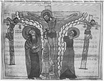 How the Jews crucified our Lord. The Virgin Mary stands on His right and St. John on His left. Between the Virgin and the Cross stands Longinus, the soldier who pierced our Lord's side. The Crusaders are said to have found the body of Longinus in the church of St. Peter at Antioch in the XIth century