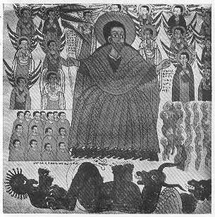 The Last Judgement. God Almighty, holding a standard with flags attached to it, sits in the centre with His angels about Him. On His right are seated the blessed, clothed, and on His left are the damned in the form of naked men and women. At His feet lie 'Diabolus, the lover of iniquity' and two other fiends