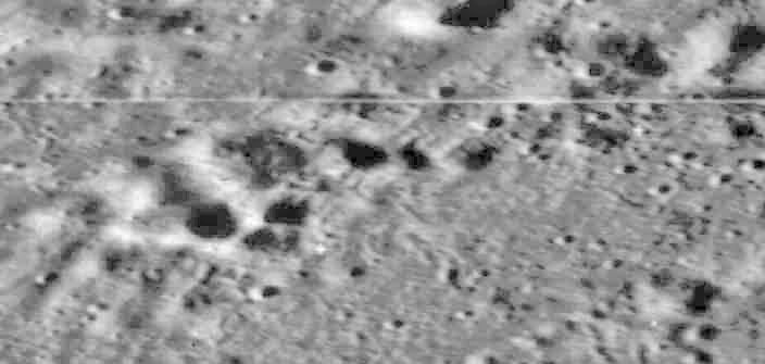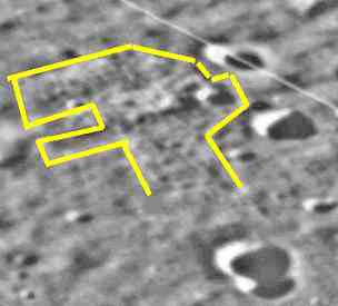 On closer inspection the fan seems to consist of two intersecting structural members barely poking through the regolith. They are very linear and have regularly spaced "Lightening holes", or dark areas, in them. There is also a dark rectangular depression just above the "Fan" that has sides perpendicular to the proposed structural girders.