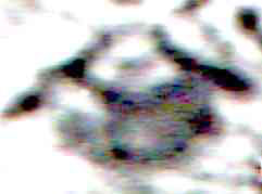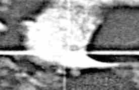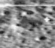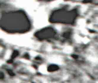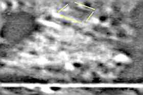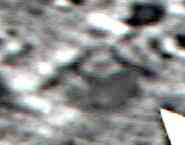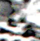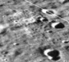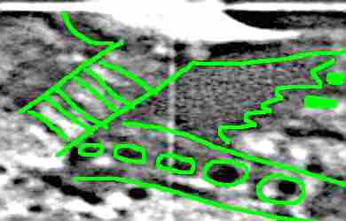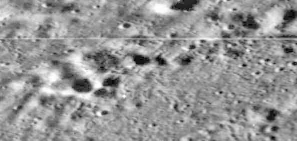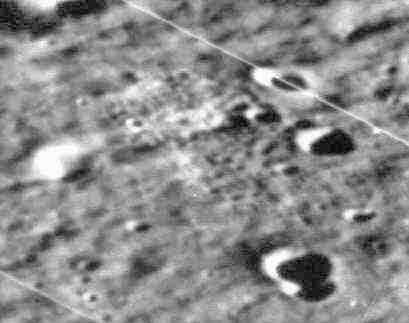 Enlargement of "Dish" and "Fan" and exposed structural girders. Just above and to the right of the "Factory" region is another set of anomalous features. Beyond the familiar pitted terrain, there are a number of features that are difficult to explain as natural. The crater itself is approximately 2 KM across and seems to be of the collapse variety. The bright triangular area just above the framelet line was what Steve Troy originally noted and dubbed the "Fan".