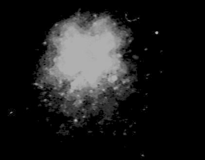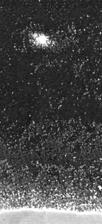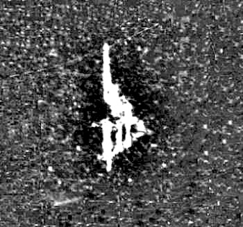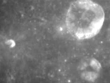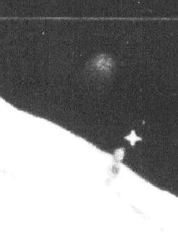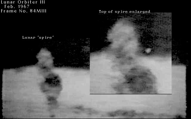 This image is an overexposed 44x enlargement of Lunar Orbiter frame LO-III-84-M. Taken with the medium resolution camera at a distance of at least 250 miles, it shows an object dubbed by Hoagland the "Shard". The star-like object above the "Shard" is a camera registration mark.