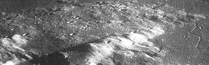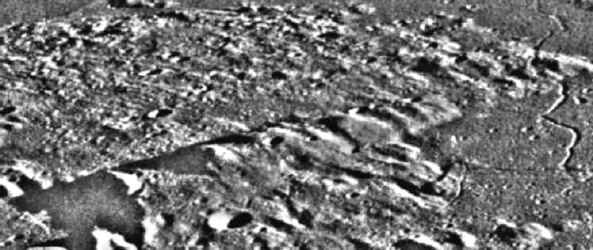 This area, roughly the size of the Los Angeles basin, displays a highly anomalous rectilinear pattern across the Lunar landscape. The arrangement is reminiscent of a ruined city, and close-up views reveal a variety of unexplainable features. Among them are the "paperclip", the "crystal palace" and what Hoagland calls "Arcology Row", the deep carved linear pattern across the mountains in the foreground.