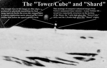 The "Shard" was the first object spotted by Hoagland on frame LO-III-84M. Sticking some 1.5 miles above the Lunar surface, it is truly an inexplicable (by current theories) wonder of the universe. Casting a shadow across the Lunar plane, alignment with the local vertical rather than the "grain" of the film, and it's proximity to the "Tower" all argue strongly for it's artificial origin.
