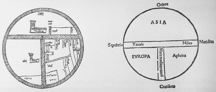 T-O maps, 12th century Sallust manuscript + copy from Zacharias' Orbis brevarium,1493 (oriented with East at the top)