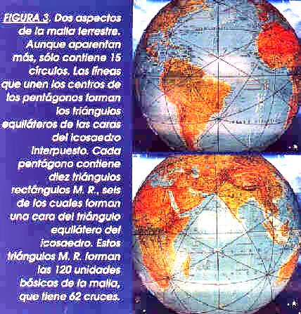 Estos 15 círculos máximos, 12 pentágonos con 10 triángulos M. R. cada uno, y 62 intersecciones, forman la malla energética que rodea la Tierra, pero dada la extensión de esos, M. R. de más de 4.000.000 de kilómetros cuadrados (dos tercios de Australia), hay pocas oportunidades de que algunos de estos focos y líneas se ubiquen en países. Se supone que los tres distintos tipos de cruces, los de pentágonos del dodecaedro, con cinco líneas, los triangulares del icosaedro, con tres y los de los rombos, que comprenden 4 M. R., con dos, tienen propiedades distintas, y entre los del mismo tipo, incluso polaridades opuestas, lo que genera corrientes energéticas por las líneas que los unen. El tipo pentágono con 5 líneas que aparentan los rayos, es el más espectacular, y precisamente uno de ellos, se halla en el cogollo del famoso Triángulo de las Bermudas.