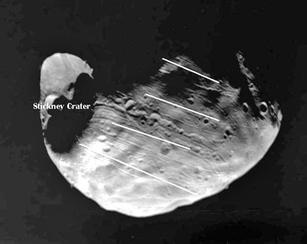 The general pattern of the striations have been marked out for you in white. Note that they DO NOT all radiate from Stickney Crater itself. Why not? If they are all a result of a huge impact, all the "cracks" should do so. However, those lines in the solid rock toward the top of Phobos don’t seem to be associated with Stickney at all. The next photo is even more compelling.