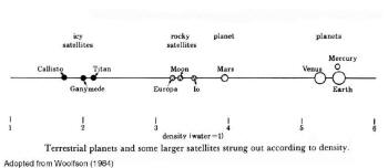 Figure 2 Terrestrial planets and larger satellites listed according to density. Mars is much closer to Earth’s Moon, Io, and Europa in density than it is to Venus, the first major terrestrial planet listed.