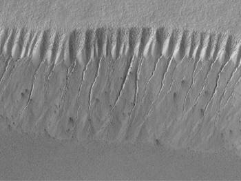 (MSSS/NASA) In 1998, one of a growing number of “independent researchers,” Byran Butcher, noticed and published on the Internet a curious “dark area.” He casually suggested it might be “a coffee stain, water, or a shadow.”15 In July 2000, the authors published a much more specific model, based on an MOC image of an unusually dark, highly elongated “stain” emanating from an exterior point source on a crater wall, proposing that it was a current water flow consistent with the model Malin and Edgett had put forth a few days earlier.16