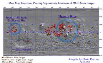 Small-scale surface features are identified which, it is proposed, are the direct product of wide spread ancient and recent bursts of subsurface liquid water. These water “stains” are shown to cluster (beyond statistical chance) in an unmistakable tidally-determined, bi-modal distribution on the planet: centered near the Tharsis and antipodal Arabia “bulges.”