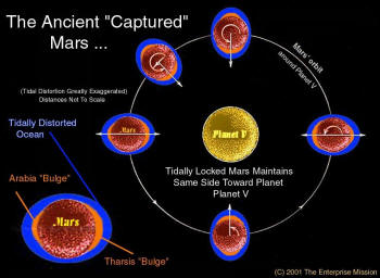This estimate is based on models of Earth’s primordial rotation slowed by early lunar tides ( Figure 7). 24 In the model, inevitable tidal evolution not only ultimately circularized Mars orbit around Planet V, it resulted in Mars finally rotating/revolving around Planet V synchronously, in approximately 24 hours -- with one side always facing Planet V, as Earth’s Moon does today.