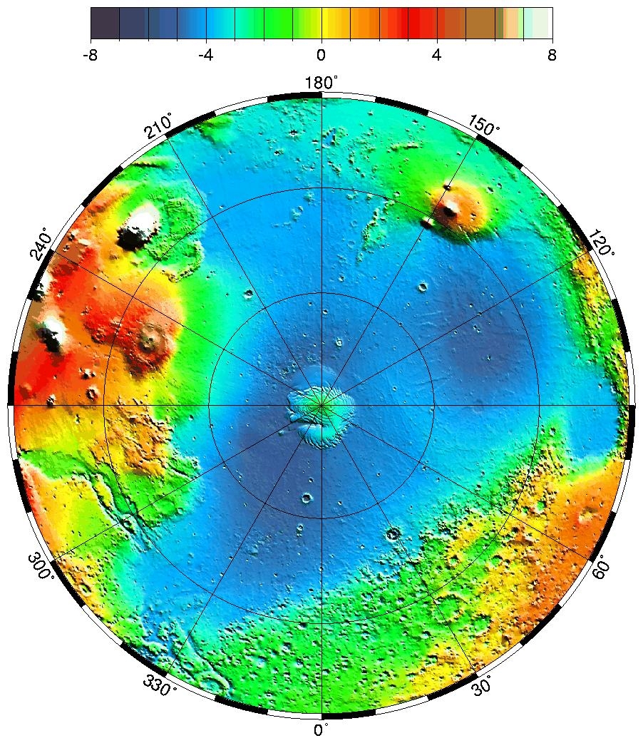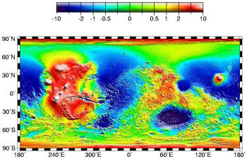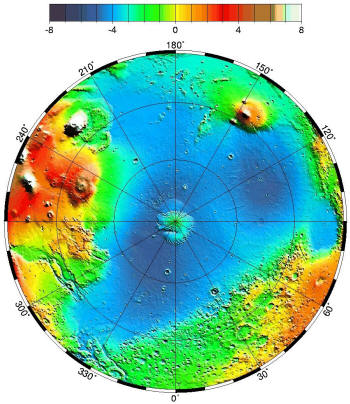 Figure 1 MOLA colorized image of Mars showing the heavily cratered southern highlands (yellow and orange) and the smooth,