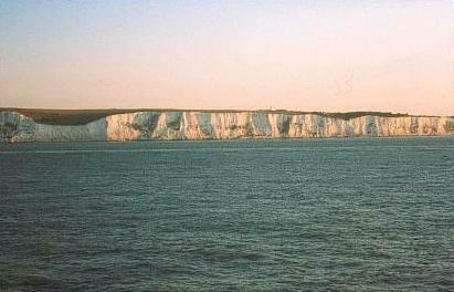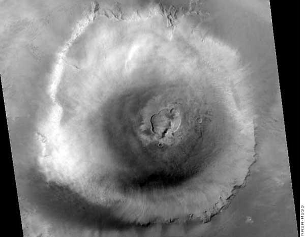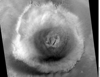 Dover, a vertical, aeolian wave action feature on Earth. Further evidence that the Olympus Mons scarp feature is due to the wind-driven action of an ocean can be found in the fact that it envelops the entire mountain (Figure 15); if a hypothetical ocean surrounded such a rising tectonic feature, the wind/ocean patterns would be expected to erode a mostly uniform scarp such as the one we see. Figure 15 Overhead view of Olympus Mons from Mars Global Surveyor. Prominent vertical scarp nearly encircles the base (NASA/MSSS).