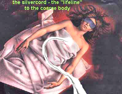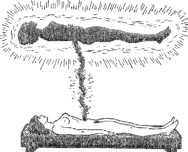 Then we jump forward to LESSON EIGHT In previous lessons we have regarded the body as being the centre of the etheric and the aura; we have moved from the body outwards, discussing the etheric and then on to a description of the aura with its striations of colour, and forward to the outer auric skin. All this is extremely important, and you are advised to go back and re - read the previous lessons, for in this lesson and lesson nine we arc going to prepare the ground for leaving the body. Unless you are clear about etheric and aura - and the nature of the molecular structure of the body - you may run into some difficulties. The human body consists, as we have seen, of a mass of protoplasm. It is a mass of molecules spread out over a certain volume of space in much the same way as a universe occupies a certain volume of space. Now we are going to go inwards, away from the aura, away from the etheric, and in to the body, for this fleshbody is just a vehicie, just "a suit of clothes - the garb (klesdrakt) of an actor who is living out his allotted (tildelte) part upon the stage - which is the world." It has been stated that two objects cannot occupy the same space. That is reasonably correct when one thinks of bricks, or timbers, or pieces of metal, but if two objects have a dissimilar vibration, or if the spaces between their atoms and neutrons and protons are wide enough, then another object can occupy the same space. You may find that difficult to understand so let us put it in a different way, let us give perhaps two illustrations. Here is the first: If you get two glasses and you fill them right up to the brim with water - you will find that if you tip a little sand - say, a teaspoonful - into one of the filled glasses, the water will overflow and will run down the side, showing that in this case the water and the sand cannot both occupy the same space, and so one has to give way. The sand, being heavier, sinks to the bottom of the water thus raising the level in the glass to the point where the water overflows. Let us turn to the other glass, which also has been filled with water to the brim - filled to precisely the same level as the first glass. If now we take sugar and we slowly sprinkle sugar into the glass, we find that we may be able to put even six teaspoonflils of sugar into the glass before the water overflows! If we do this slowly -we wilt see the sugar disappear, in other words, it dissolves. As it dissolves, its own molecules occupy spaces between water molecules, and thus it does not take up any more space. Only when all the space between the water molecules has been filled with sugar molecules, does the excess sugar pile up on the bottom of the glass and eventually cause the water to overflow. In this case we have clear proof that two objects can occupy the same space. Let us have another illustration; let us look at the solar system. This is an object, an entity, a "something." There are molecules, or atoms, which we call worlds, moving about in space. If it is true that two objects cannot occupy the same space, then we could not send a rocket from the Earth into space! Nor could people from another universe enter this universe, because if they did so they would be occupying OUR space. So under suitable conditions - it is possible for two objects to occupy the same space. The human body, consisting of molecules with a certain amount of space between atoms, also houses other bodies, tenuous ("tynne") bodies, spirit bodies, or what we call astral bodies. These tenuous bodies are precisely the same as to composition (sammensetning) as is the human body, that is, they consist of molecules. But just as earth or lead or wood consists of a certain arrangement of molecules - molecules of a certain density - spirit bodies have their molecules fewer and further between each. Thus it is quite possible for a spirit body to fit into a flesh body in the most intimate contact, and neither occupies space needed by the other. The astral body and the physical body are connected together by the Silver Cord. This latter is a mass of molecules vibrating at a tremendous speed. It is in some ways similar to the umbilical cord, which connects a mother to her baby; in the mother -impulses, impressions, and nourishment flow from her to the unborn baby. When the baby is born and the umbilical cord is severed, then the baby dies to the life it knew before, that is, it becomes a separate entity, a separate life, it is no longer a part of the mother, so it "dies" as part of the mother and takes on its own existence.