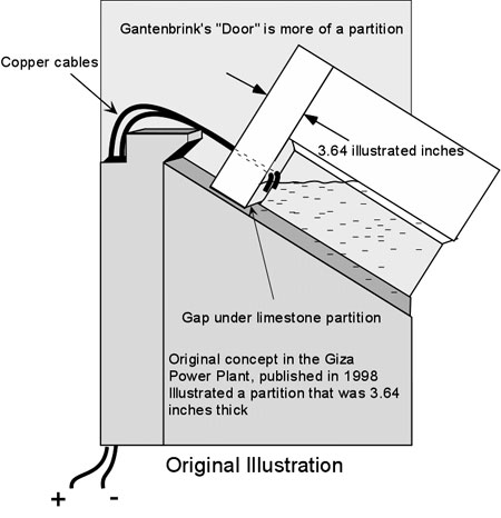 The exploration of the Northern Shaft and what was discovered at the end was predictable and, without any shadow of a doubt vindicates the purpose for these shafts as outlined in The Giza Power Plant. The image of another "door" with copper fittings and the subtle difference between these fittings and those at the end of the Northern Shaft supports the hypothesis regarding the chemicals used. The electrodes are affected by different chemicals a different way. In the Southern Shaft, the action of the dilute hydrochloric acid eroded the copper over time. Because the upper part of the copper was covered with chemical for a shorter period of time than the lower part, as the fluid was always falling, the lower part of the copper was eroded more that the upper part.