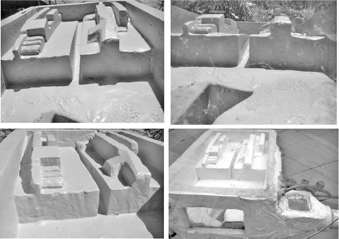 Views of the Fluid Dynamics Model Looking towards the step gives a perspective of the fin arrangement. (Upper Right) Looking through glass eastern wall with pit in foreground. (Lower right) Glass eastern wall can be seen as well as glass topped ante chamber.