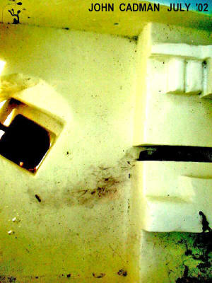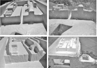 Erosion in Subterranean Chamber (Left) The antechamber before the subterranean chamber shows significant erosion on the ceiling where trapped air allowed turbulence and splashing of water. Photo: Edgar Brothers (Right) Reconstruction of a fin shows extent of erosion in finned area. The builders always used angular sufaces as opposed to the curved surfaces that are present in the fins. The fin on the right shows more extensive damage. Photo: