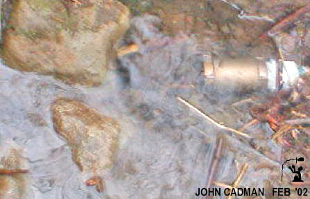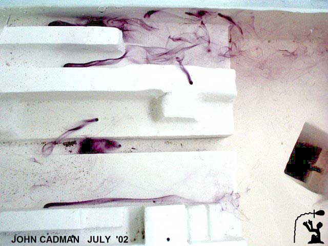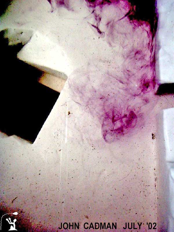 Dynamics at the Step Channel (Left) Looking down on the step face as well as the pit, the ink shows the flow running along the face of the step. As it arrives at the step channel this flow is diverted. Erosion on the floor exactly matches this pattern. The pit’s diagonal offset is exactly aligned with the tunnel to the Nile. (Right) Ink is injected into the step channel showing flow direction and that it diverts the face flow.