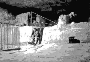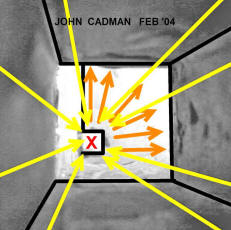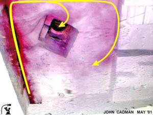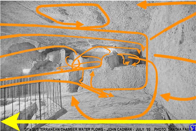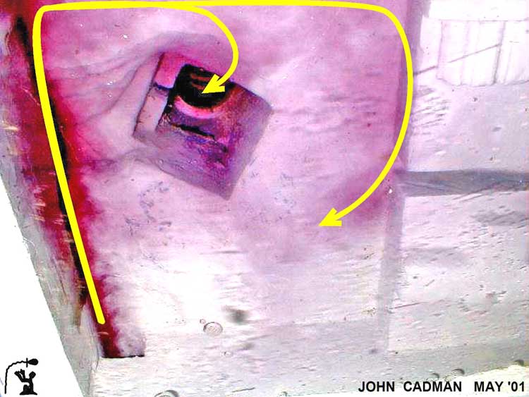 into Subterranean Chamber from the Antechamber (Left) The entrancer jet (yellow) shoots from the horizontal passage across the subterranean chamber to the entrance of the “dead end“ shaft (red X). The “dead end” shaft is a water output. The left wall is continuous from the antechamber through to the “dead end“ shaft and functions as a guide. As part of the jet strikes the far wall, it is deflected up and to the right (orange). (Right) The entrance jet is shown shooting across the room. Because the pit is offset from the far wall, the ceiling-to-pit flow misses the jet. Extensive erosion on the ceiling exactly matches the flow patterns. The area at the top of the picture appears to be cavitation damage from the extreme low pressure rarefaction wave. Photo: Edgar Brothers