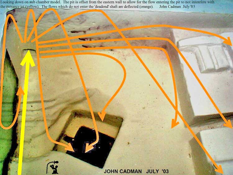 Dynamics in the South Eastern Quadrant (Left) Looking down on model shows ink being injected in entrance jet. The entrance jet shoots across the room where part of the flow is deflected by the far wall. (Right) Ink is being injected in six ports around the “dead end” shaft. The yellow entrance jet shoots towards the entrance of the high pressure output. The orange arrows show the deflection around the “dead end” shaft. Notice how there is a flow from the ceiling down into the pit. The pit is offset from the eastern wall to prevent this ceiling-to-pit flow from interfering with the yellow entrance jet. This completely explains the pit’s offset from the wall. The sloped area at the top of the pit is erosion caused by a major flow into the pit. At Giza, this area has been filled with bricks to accommodate hand-rails.