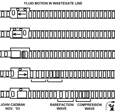 Wastegate (Left) Piston striking valve seat stops water flow instantaneously and causes compression of the water. The compression of the water causes high pressure compression wave and low pressure rarefaction wave. The low pressure rarefaction wave reopens the valve. (Right) The submerged horizontal wastegate in action. It runs better once the valve is submerged.