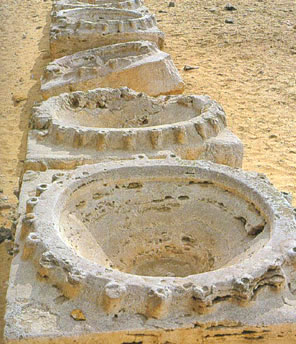 chamber For what use these basins were intended is another mystery. According to Petrie's analysis, these might have been to hold the butt ends of beams which supported the sloping roof-blocks during the building. It is possible, however, that oil, water or honey or some other purifying substance was poured into the bowls. Purification bowls have been found from the Old Kingdom such as the nine alabaster bowls found in the court of Niuserre's sun temple. These measure about 1.18 meters in diameter. Borchardt suggested that they may have been used to store the blood of slaughtered sacrificial beasts but this has been doubted due to the lack of the accompanying evidence that is usually found at such sites.