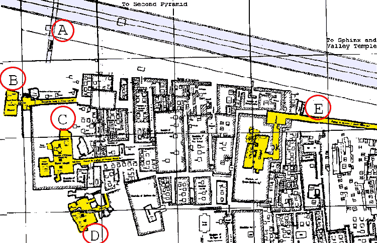 with tunnel (subway) and "Watershaft" entrance. B - Passage leading to Rock Tomb of Iwn-Ra. C - Passage leading to Mastaba of Princess Hemet-Ra. D - Entrance and Tomb of Prince Ankh-ma-Ra. E - Passage leading to Mastaba of Queen Rekhit-Ra.