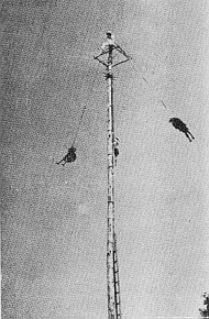 FIGURE 12. Raising the Flying Pole in Chichicastenango. The "monkey" climbs higher as the pole is raised (Courtesy of Ovidio Rodas Corzo).