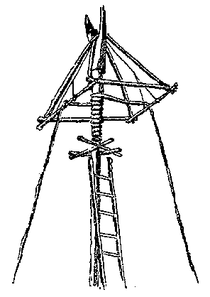 FIGURE 15. Mechanism of the Flying Pole used in Joyabaj, according to a sketch by F. Termer. The dual deity in the center of the highest Heaven is portrayed in the forked cap-piece. The cosmic quadrangle is represented by the four-sided, pyramidal frame suspended from the cap-piece.