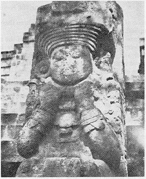 Figure 3. Stele standing at the foot of the western staircase of a temple of the ball court, Copán. Note the solar ray glyph on the wristbands, the ear ornaments, and the headdress: the "elements of splendor" referred to in the Popol Vuh and the Chortí drama.